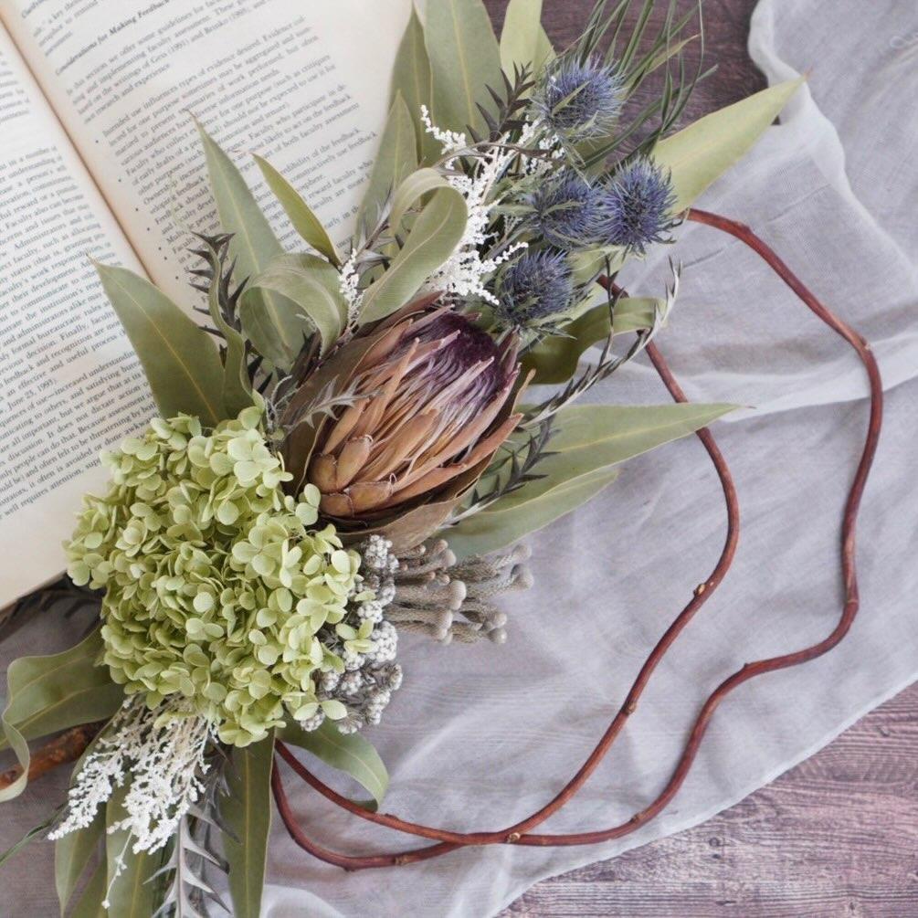 ドライフラワーに仕立てるところから制作を楽しみ、季節のアレンジメントや一つの作品にしています⁂