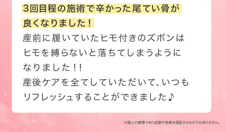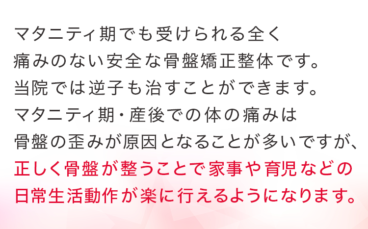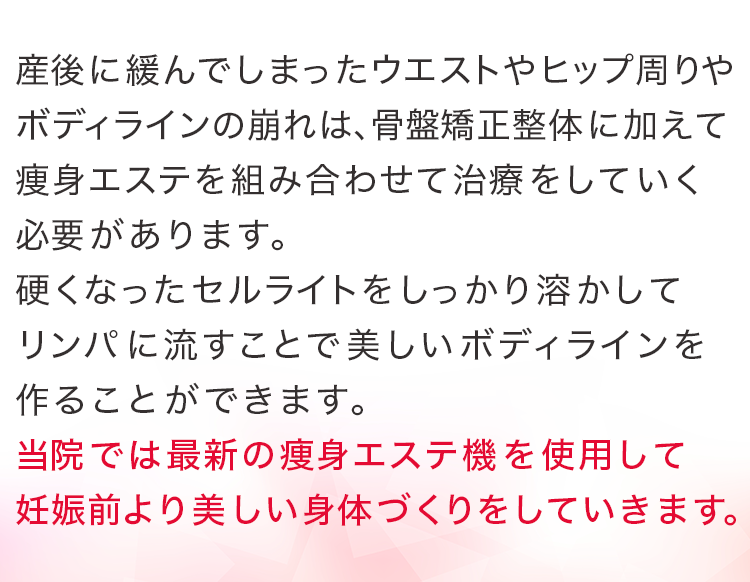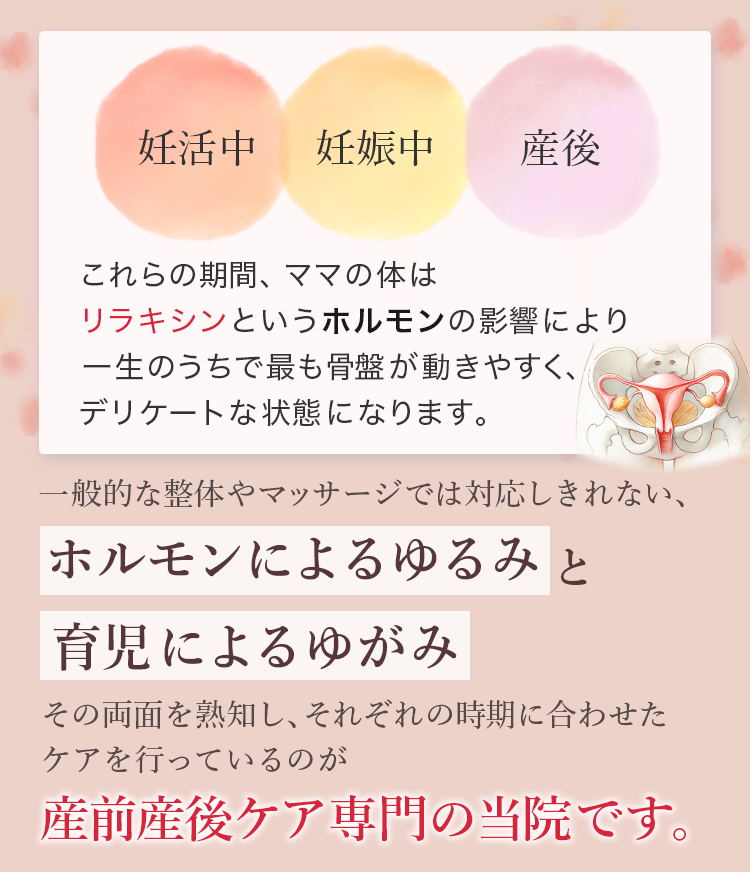 にもかかわらず、産後の体の女性の体についてしっかりとした技術と知識がない中で施術を行っている院がほとんどです。