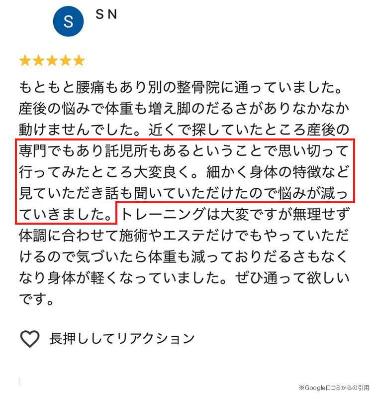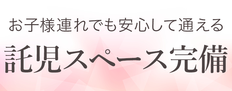また、赤ちゃんのお世話などで、なかなか自分自身に目を向ける機会がないママ達が多いですが、当院ではそんなママ達がリラックスして施術を受けてもらえるように託児サービスもお付けしております。