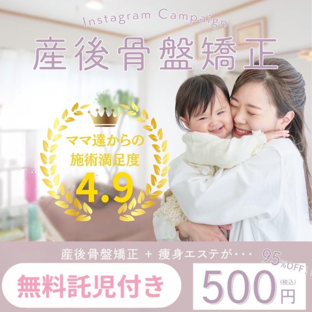 施術実績3万件、「初回に変化を感じた!」のお声を95%のママたちに頂いている産後専門整体です。